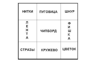 Задание "Скрап-кроссворд" от CraftPremier - верхняя горизонталь: нитки-шнур-пуговица (пуговица-снежинка и красная пуговица)